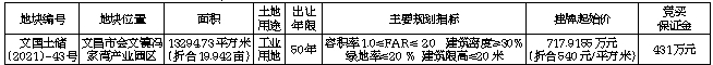 七、开发建设要求:(一)竞得土地后,竞得人须按照签订的《成交确认书》约定与文昌市自然资源和规划局签订《国有建设用地使用权出让合同》,按合同约定及时缴纳土地出让金。(二)本次出让宗地属工业项目用地。竞得该宗土地后,竞得人须在挂牌出让成交之日起二个月内完成项目规划设计方案,具备规划报建条件,并严格按照批准的项目规划设计方案要求,以及有关部门的行业规定,在三个月内动工建设项目,一年半内完成项目的投资建设。不按批准的项目规划设计要求进行开发建设和不在三个月内动工建设项目的,由受让人向出让人支付相当于宗地出让价款1‰的违约金。取得土地超过一年未动工的,推送信用平台。受让人不履行《国有建设用地使用权出让合同》约定的,报经市政府批准后,按该合同约定,退还除该合同约定的定金以外的全部或部分国有建设用地使用权出让价款(不计利息),收回国有建设用地使用权;受让人造成土地闲置,按照《海南自由贸易港闲置土地处置若干规定》执行。(三)本次出让宗地按净地条件出让,即土地权利清晰、安置补偿落实到位、地上附着物清表、无法律经济纠纷、土地开发利用规划条件明确,符合海南省政府(琼府〔2018〕3号)文件规定具备动工开发所必需条件。竞买人应当现场踏勘出让地块,竞买人申请参加竞买的,视为对出让地块的净地条件无异议,在竞得土地后,竞得人须同意与出让人按该净地条件签订《国有建设用地交地确认书》确认出让地块交地开发建设。(四)按照《关于印发<海南省建设用地出让控制标准(试行)>的通知》(琼国土资规〔2018〕7号)和《关于实施产业项目发展和用地准入协议的指导意见》(琼国土资规〔2018〕8号)有关规定,本次出让宗地工业项目用地控制指标,投资强度为不低于300万元/亩,不设定年度产值指标和年度税收指标,开发建设的项目产值和税收征缴按照现行有关法规政策规定执行,达产年限5年。以上控制指标按规定列入《产业项目发展和用地准入协议》,属于协议内容的组成部分,竞得人在签订国有土地使用权出让合同时,一并与文昌市农业农村局签订《产业项目发展和用地准入协议》。(五)竞得土地后,竞得人拟在文昌注册成立新公司进行开发建设的,应在竞买申请书中明确新公司的出资构成、成立时间等内容。(六)竞得土地后,竞得人须按规定完善该宗地施工报建、地质、压覆矿、消防、环保、土壤等审批手续,方可动工建设。(七)根据《文昌市住房和城乡建设局关于文国土储〔2021〕-43号地块建设项目装配式建造意见的复函》,该项目需要采用装配式方式建造。