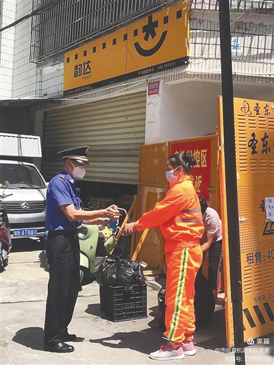 有居民在家隔离久了,走到警戒线附近想外出,被劝导了回去;有居民在取外卖的过程中,和外卖小哥产生了肢体接触,被教育指正……在烈日下,和利永以严谨细致的工作态度,及时发现并纠正了不少不规范行为。