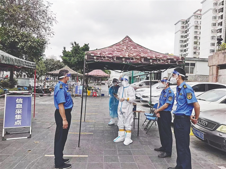 “我们与三亚市疫情防控指挥部、三亚市综合行政执法局、三亚市公安局3个部门对接,分别把200名执法人员派到天涯公安分局担负社会面管控的任务;100名执法人员派到三亚市综合行政执法局吉阳分局担负社会面管控的任务;11名医护人员则在三亚市综合行政执法局的院子里设立了一个核酸检测点,为海口、儋州、东方、保亭等支援三亚疫情防控的人员每天进行核酸检测。”江定清介绍说。