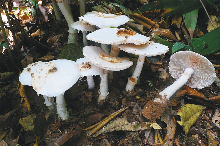 在海南,常见的出自“鹅膏属”的还有小致命鹅膏、异味鹅膏、拟卵盖鹅膏、欧氏鹅膏、假褐云鹅膏等,它们都含有剧毒,且形象似一把白色小伞,广泛存在于热带雨林中,让人很难辨别。