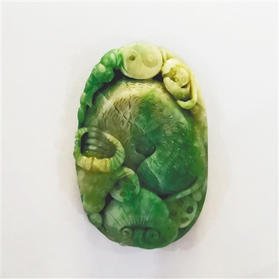独山玉石玉质坚韧致密,摩氏硬度可达6—6.5,一般为玻璃光泽或油脂光泽,与和田玉相比,温润度略差。但是,质量较高的翠绿色独山玉与翡翠相似,故又被称为“南阳翠”。独山玉的色泽大都斑驳陆离,有绿、粉、白、紫、黑等色调,一块玉石有两种或两种以上的颜色,属于多色玉石的范畴。缘于其多色性,常见的独山玉制品多用俏雕技法雕制大型山水花鸟摆件,首饰之类的小挂件则相对少见。