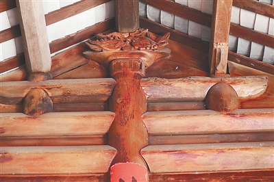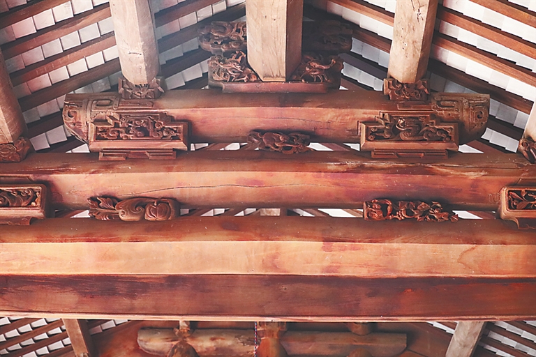 拜殿开间总开间为43路瓦,主厅分格为21路瓦,进深为11架檩,大厅为抬梁式梁架,支柱为木制金柱、石制夹墙柱及檐柱的六柱构造,金柱支撑起五架梁和檩,由木雕宝瓶瓜柱托三架梁和檩,由木雕花篮脊柱托起脊檩,抬梁两侧由夹墙柱及檐柱托两包头梁。