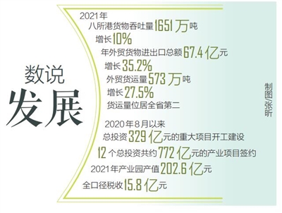 据悉,2021年,八所港货物吞吐量1651万吨、增长10%。八所口岸被列入海南自贸港重要对外开放口岸和“二线”口岸布局,2021年外贸货物进出口总额67.4亿元、增长35.2%,外贸货运量573万吨、增长27.5%,货运量位居全省第二。