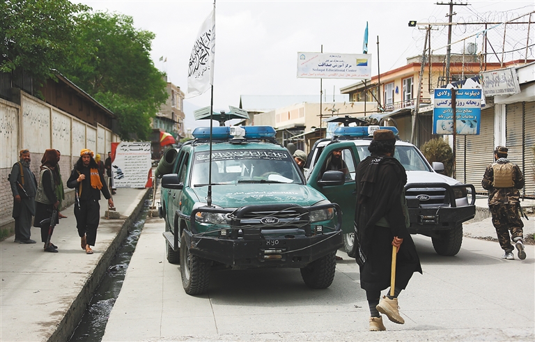 这是4月19日阿富汗塔利班人员在遭爆炸袭击的一所高中附近执勤。新华社发
