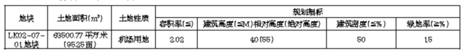 一、挂牌先租后让土地的基本情况:本次挂牌先租后让的宗地位于海口市江东新区LK02-07-01地块,土地总面积为63500.77平方米(95.25亩),土地用途为机场用地,租赁期2年,出让年限48年(如租赁期因租赁评价考核目标未达到准入要求申请延长租赁期的,经批准,租赁期限至多延长一年。如租赁期延长,出让年限为该宗土地用途法定最高出让年限减去租赁期)。根据海口市江东新区控规成果,江东新区LK02-07-01地块的规划情况详见下表:
