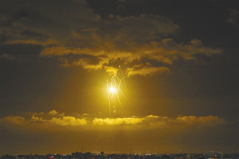 4月21日,以色列“铁穹”防御系统发射出的导弹划过加沙城的夜空,拦截从加沙地带发射的火箭弹。新华社发