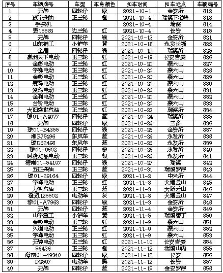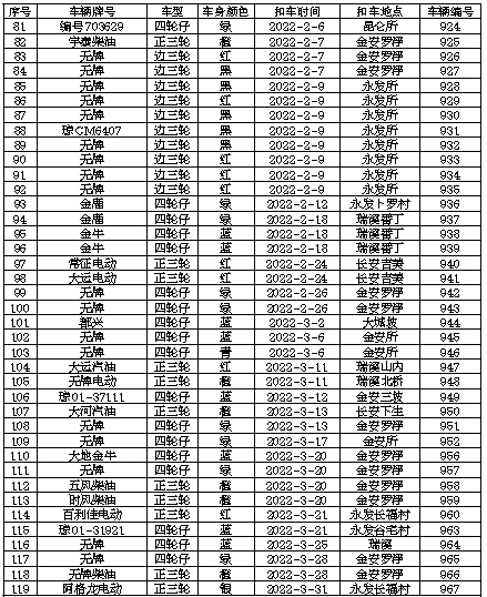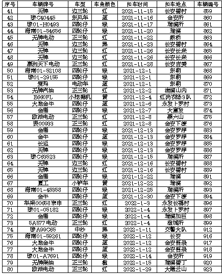 我局在2021年10月1日至2022年3月31日期间在澄迈县各乡镇执法检查过程中查处到涉嫌违法装载河砂的车辆及机具。因车辆和机具的所有权人不明,从本公告发布之日起一年内,请公告清单列表上的所有车辆和机具的所有权人携带个人身份证及其他证明车辆、机具来源材料到澄迈县综合行政执法局1楼县“多规合一”管控行政执法大队办理认领登记手续。逾期未认领的,我局将依法移送相关部门进行无主物的财产处置。办公室电话:0898-67615217,地址:海南省澄迈县金江镇金马大道党校一楼。 澄迈县综合行政执法局 2022年4月25日