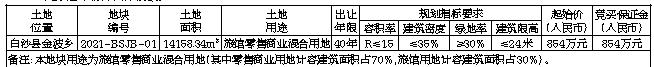 六、开发建设要求:(一)拟定投资强度不低于250万元/亩,年度产值不低于300万元/亩,年度税收不低于10万元/亩,达产年限5年,以上出让控制指标按规定列入《产业项目发展和用地准入协议》,属于协议内容的组成部分。竞得人在签订《国有建设用地使用权出让合同》时,须提交与白沙黎族自治县发展和改革委员会签订《产业项目发展和用地准入协议》,并严格按照协议约定内容进行开发建设,否则将承担相关违约责任。(二)本次出让地块按净地条件出让,即土地权利清晰、安置补偿落实到位、地上附着物清表、无法律经济纠纷、土地开发利用规划条件明确、符合土壤环境质量要求、具备动工开发所必需条件。竞买人应当现场踏勘出让地块,竞买人申请参加竞买的,视为对出让地块净地条件无异议。(三)竞得人在足额缴纳全部成交价款和相关税费后,依照规定程序办理用地和土地登记手续。竞得人须在取得土地使用权之日起一年内动工开发建设,项目整体建设必须在三年内完成,如造成土地闲置,按照《海南自由贸易港闲置土地处置若干规定》执行。(四)竞得人取得地块后须按批准的规划方案进行建设。挂牌地块出让后,任何单位和个人无权擅自更改规划和建设条件。因非企业原因确需调整的,必须依据相关规定的公开的程序进行,由开发建设单位提出申请调整规划建设条件而不按期开工的,必须收回土地使用权,重新按拍卖、挂牌方式出让土地。(五)根据《海南省自然资源和规划厅 海南省住房和城乡建设厅 海南省市场监督管理局关于加强商业、办公类建设项目全过程管理的意见》有关规定,严禁旅馆用地建设项目分割销售和不动产登记。(六)该地块若实施装配式建筑,须按装配式建筑有关规定进行。