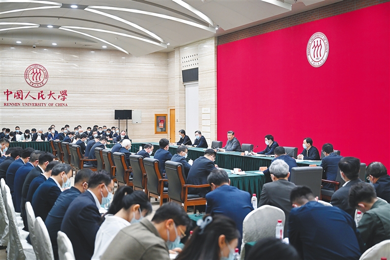 在认真听取大家发言后,习近平发表重要讲话。他强调,我国有独特的历史、独特的文化、独特的国情,建设中国特色、世界一流大学不能跟在别人后面依样画葫芦,简单以国外大学作为标准和模式,而是要扎根中国大地,走出一条建设中国特色、世界一流大学的新路。中国人民大学从陕北公学成立之初就鲜明提出要培养“革命的先锋队”,到新中国成立之初提出培养“万千建国干部”,到改革开放新时期提出培养“国民表率、社会栋梁”,再到新时代提出培养“复兴栋梁、强国先锋”,始终不变的是“为党育人、为国育才”,展现了“党办的大学让党放心、人民的大学不负人民”的精神品格。希望中国人民大学落实立德树人根本任务,传承红色基因,让听党话、跟党走的信念成为人大师生的自觉追求。