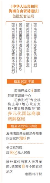 此外,我省还出台《海南省多元化解纠纷条例》,以地方立法形式明确建立多元化国际商事纠纷解决机制。截至2021年底,海南已成立4家国际商事调解中心,初步形成了“专业机构主导+地方政府支持+主管机关指导”的多元化国际商事调解格局。