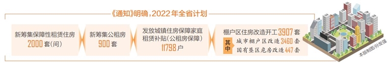本报讯 (记者孙慧 通讯员杨洲)近日,省住房和城乡建设厅、省发展和改革委员会、省财政厅、省自然资源和规划厅联合印发《关于下达2022年保障性租赁住房、公租房保障和棚户区改造计划的通知》(以下简称《通知》)。《通知》明确,2022年全省计划新筹集保障性租赁住房2000套(间),新筹集公租房900套,发放城镇住房保障家庭租赁补贴(公租房保障)11798户,棚户区住房改造开工3907套,其中城市棚户区改造3460套,国有垦区危房改造447套。