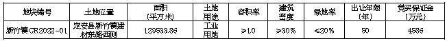 三、竞买事项:(一)竞买人资格范围:中华人民共和国境内外的自然人、法人或其他组织均可申请参加竞买(注:失信被执行人不得参加本次竞买)。本次挂牌出让不接受联合申请,属境外的企业或其他组织的,须提供境外公证部门的公证书及法律规定的其他文件。该宗地竞买人资质由定安县塔岭工业园区管理委员会初审。具有下列行为竞买人不得参加本次土地出让挂牌:1.在定安县范围有拖欠土地出让金行为,并未及时改正的。2.在定安县范围有因自身原因造成闲置土地,并未及时纠正的。3.根据《海南省自然资源和规划厅关于加强土地供应竞买人资格审核的通知》(琼自然资函〔2020〕1753号)文件规定,原非法占地、违法建设行为人。(二)申请人竞得土地后,拟成立新公司进行开发建设的,竞得人在新公司中出资比例不得低于50%(不包含50%)。(三)本次国有建设用地使用权挂牌出让设有底价,按照价高且不低于底价者得的原则确定竞得人。(四)竞买咨询及报名期限:本次挂牌出让的详细资料和具体要求,见挂牌出让文件,有意参加竞买者可到定安县自然资源和规划局218办公室或海南省公共资源交易服务中心一楼受理大厅3号窗口查询和获取挂牌出让手册,并按挂牌出让手册的具体要求报名参加竞买。报名期限:2022年4月27日至2022年5月25日(以竞买保证金实际到账为准)。(五)竞买保证金:申请人应在2022年5月25日16:00前将竞买保证金存入指定账户(以到账为准)。(六)资格确认:经审查,申请人按规定交纳竞买保证金,具备申请条件的,我局将在2022年5月25日17:00前确认其竞买资格。(七)挂牌报价时间及地点:挂牌起始时间:2022年5月17日08:00。挂牌截止时间:2022年5月27日11:00。挂牌地点:海南省政府会展楼二楼省公共资源交易服务中心土地交易厅。(八)本次竞买活动只接受书面报价,不接受电话、邮寄、电子邮件、口头等其他方式报价。