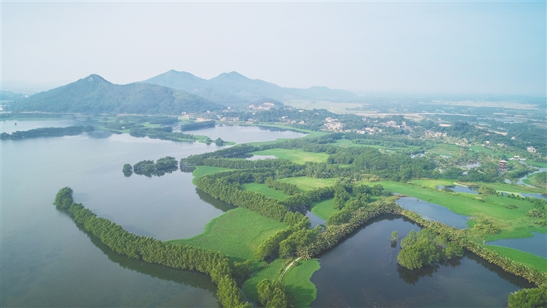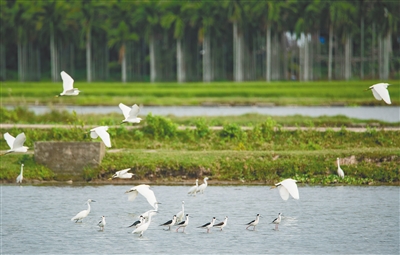 从空中俯瞰琼海,清澈的万泉河水静静流淌,两岸郁郁葱葱,水鸟嬉戏其中,偶有一排竹筏撑过,胆大的鸟儿逐筏而去,绘成一幅人鸟和谐的生态美景图。
