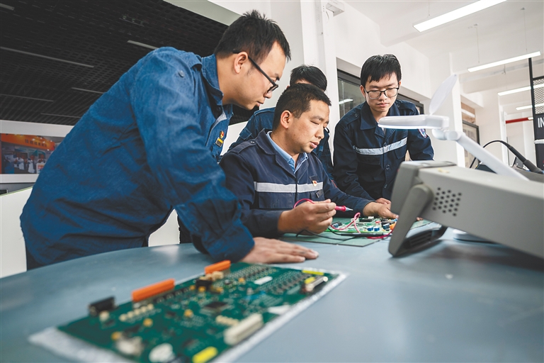 王超(左二)在工作室内与团队成员讨论电路板检修问题。