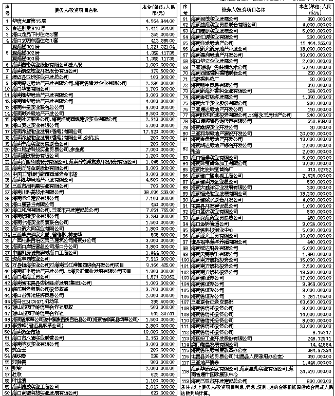 海南联合资产管理有限公司作为下列债权(包括本金和利息)及附属权利、股权、其他类资产及其相关权益的受让方,现公告要求各债务人、担保人及其他义务人立即向海南联合资产管理有限公司履行相应合同约定或法院判决所确定的义务(若债务人、担保人及其他义务人因各种原因更名、改制、歇业、吊销营业执照或者丧失民事主体资格,请相关承债主体、清算主体代为履行义务或者承担清算责任)。特此公告。