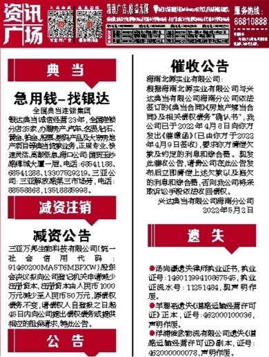根据海南北源实业有限公司与兴达典当有限公司海南分公司依法签订的《典当合同》《房地产续当合同》及相关债权债务“确认书”,我公司已于2022年4月8日向你方发出《催缴函》(已由你方于2022年4月9日签收),要求你方清偿欠款及约定的利息和综合费。现发此催收公告,请贵公司在此公告发布后立即清偿上述欠款以及拖欠的利息和综合费,否则我公司将采取诉讼手段依法收回债权。