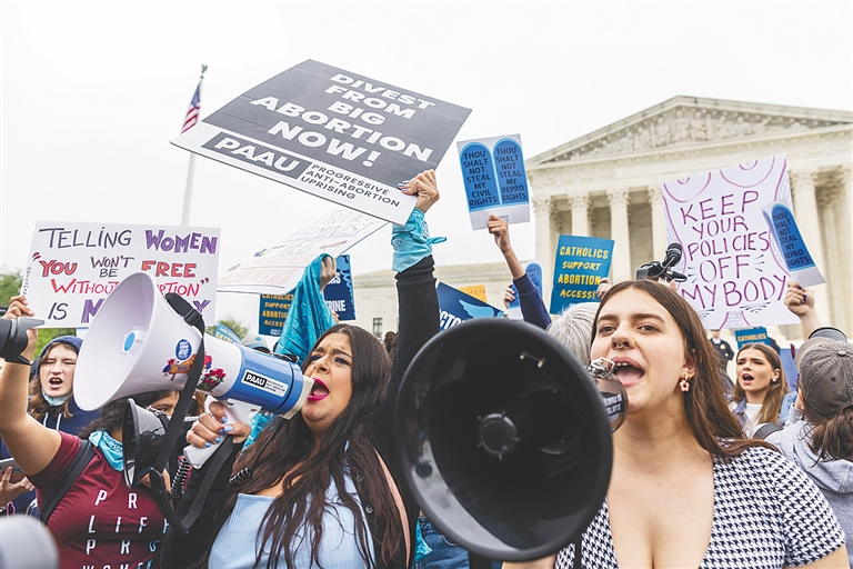 5月3日,在美国华盛顿,支持和反对堕胎权的人们在美国联邦最高法院外集会。