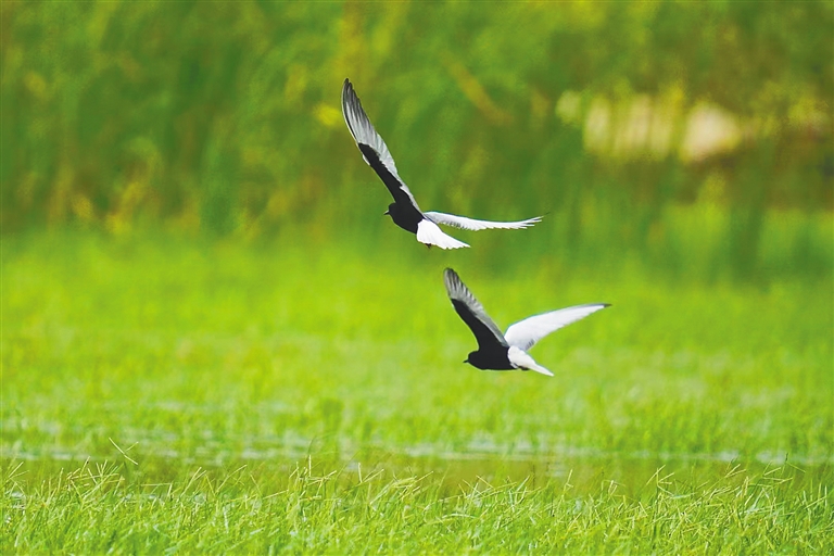 本报石碌5月5日电 (记者刘婧姝 特约记者黄兆雪)黑头白尾,身形小巧,展翅飞翔,灵动十足。5月5日,昌江黎族自治县海尾国家湿地公园(试点)内,一群迁徙过境的“新朋友”,吸引不少爱鸟人士驻足观赏。