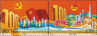 据了解,《中国共产主义青年团成立一百周年》纪念邮票以一套2枚、双联票的形式发行。邮票第1图“永远跟党走”以党徽与团旗为主体,团旗紧紧跟随着党徽,辅以数字“100”及奋斗在各行各业的青年群像剪影,突出共青团紧跟党走的政治定位。邮票第2图“请党放心 强国有我”以共青团团徽为主体,辅以数字“100”、高铁、火箭、楼宇等画面内容,寓意广大共青团员为建设繁荣祖国、实现中华民族伟大复兴贡献青春力量的壮志豪情。