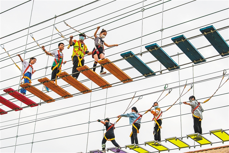 5月3日,在海口市郊一主题乐园,孩子们挑战新奇有趣的“步步惊心”项目,享受欢乐刺激,玩转“五一”假期。