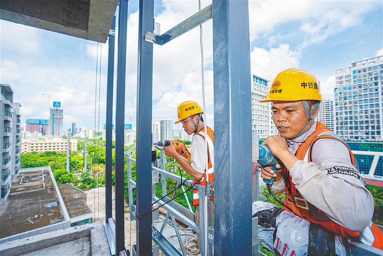 5月8日,工人在三亚中央商务区企业孵化基地项目开展装修作业。该项目已顺利实现封顶,投用后将致力于解决三亚市中小企业创业缺乏集中办公场所的问题,为优质企业入驻三亚保驾护航。本报记者 袁琛 摄