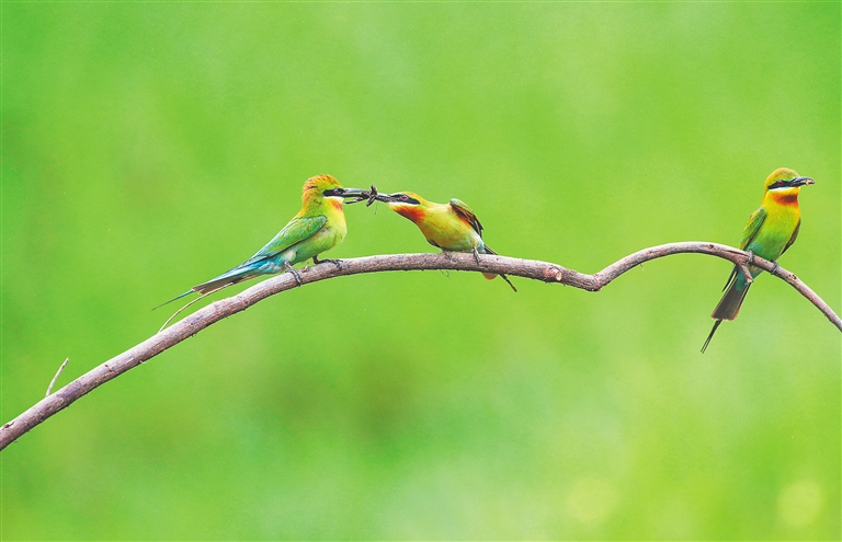 5月7日,在海口五源河国家湿地公园,雄性栗喉蜂虎向雌性栗喉蜂虎“投喂”虫子。