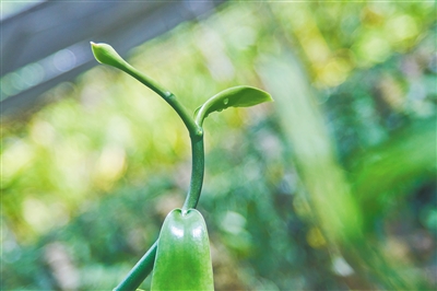 其实,长在藤蔓上的香草兰豆荚并没有什么香味,据香饮所科研人员介绍,香草兰经过扦插栽培,生长两年半到三年后即可结豆荚,豆荚一年一采,三五月开花,十二月到次年一月是收获期。豆荚采摘下来,经过杀青,然后用干净毛巾包上“发汗”,自然发酵,慢慢地颜色会由绿色变成褐色,香味也会慢慢散发出来。之后,还会移进一个密闭的干燥空间,让其“陈化生香”两个月左右,以充分散发出香味。豆荚提香过程历时半年。