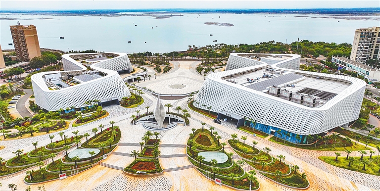 俯瞰洋浦经济开发区滨海文化广场。目前,随着众多商业体进驻及洋浦经济开发区展示馆对外开放参观,滨海文化广场成为洋浦最热闹的商业及休闲场所。本报记者 陈元才 摄