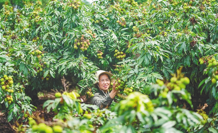 2022澄迈大丰荔枝乡村旅游嘉年华于5月10日在澄迈县大丰荔枝观光园启动。该活动将通过“电商助农+主播带货+达人团购+抖音大丰荔枝品牌秀”的新媒体营销矩阵,进一步推广大丰荔枝和澄迈乡村旅游品牌。图为果农在荔枝园里采摘荔枝。本报记者 陈元才 摄