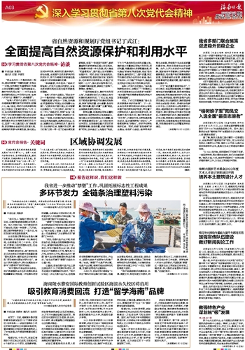 对于“高质量发展海洋经济”,丁式江表示,将坚持陆海统筹,大力推动海洋经济高质量发展,服务海洋强省战略实施;积极推进海洋油气开发、海上风电、海洋装备、海洋牧场等产业和项目建设;突出创新驱动,推动国家海洋综合试验场(深海)、深海科技创新公共平台、三亚深海化合物资源中心建设;继续推进海口海洋创新发展示范城市、陵水海洋经济发展示范区建设;开展海洋碳汇试点,推进蓝碳增汇示范工程,探索建立蓝碳标准体系及交易机制;加强海域海岛使用动态监管,积极推进海洋生态预警监测体系建设。