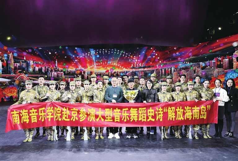 三、服务社会,彰显协同育人之效能。学院积极引导青年学生以实际行动践行社会主义核心价值观和“爱国、为民、崇德、尚艺”的文艺核心价值观,不断探索社会服务的新思路与新举措,服务自贸港建设发展。作为省委宣传部、省旅文厅的特邀合作单位,学院组织团队参加了海南省残疾人运动会开幕式、少数民族“三月三”汇演活动、海南岛欢乐节、全国沙滩排球总决赛开闭幕式、海南省东盟大学生文化周等一系列大型文艺演出活动;近三年来,学院先后组织师生到武警海南总队、海口演丰镇敬老院等单位进行慰问演出12场次,直接参演师生达900多人次;学院连续6年赴学校定点帮扶点乐东黎族自治县温仁村定期组织慰问演出,并常年为桂林洋中学、桂林洋中心小学提供美育共建服务。2022年1月,海经院40名学子参演了由省委宣传部、省委统战部、省旅文厅联合主办的2022海南新年专场演出原创舞蹈诗《锦绣家园》。特别值得一提的是,2021年6月,学院100名学生受邀参演省委宣传部主导的大型音乐舞蹈史诗《解放海南岛》,该节目作为冬奥会艺术节力荐的保留节目,于2022年1月中旬在北京保利剧院成功上演。