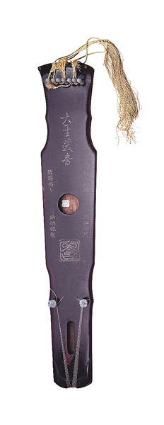 大圣遗音琴,制于唐至德元年(756年)。通长120.3厘米,肩宽20.2厘米,尾宽13.5厘米,厚5.2厘米,底厚20.2厘米。桐木制,栗壳色漆与黑漆相间,局部略有朱漆修补。金徽玉轸,形制浑厚,圆形龙池,匾圆形凤沼,琴背题名、大印及铭文都是制琴时镌刻的。腹款朱漆书“至德丙申”四字在池的旁边。制琴的时间,正当安禄山叛变,唐明皇入蜀,太子在灵武即位改元至德的时候。此琴造型优美,色彩璀璨古穆,是琴中之宝。