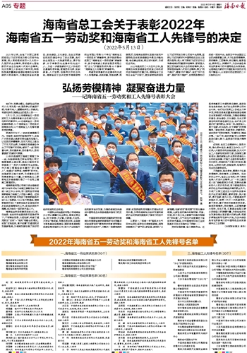 2022年海南省五一劳动奖和海南省工人先锋号名单