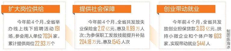 从促进创业带动就业上看,今年前4个月,全省共发放创业担保贷款3.03亿元,扶持小微企业和个体户等603家,实现带动就业5441人;4月中旬启动海南自贸港创业大赛,引导更多创新创业人才投身海南建设,目前已吸引577个项目报名。更立体、丰富的创业服务,带动就业量与质的提升,让劳动者的潜力、才能得到充分发挥。