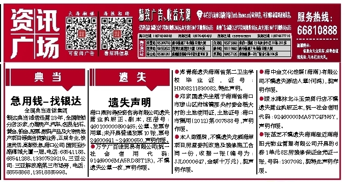 银达典当诚信经营23年,全国连锁分店25家,办理房产、汽车、名表、钻石、黄金、铂金、股票、数码产品及大宗房地产项目等典当贷款业务。正规专业、快速灵活、高额低息。海口公司:国贸玉沙路椰城大厦一层。电话:68541188、68541288、13307529219。三亚公司:三亚解放路第三市场旁,电话:88558868,13518885998。