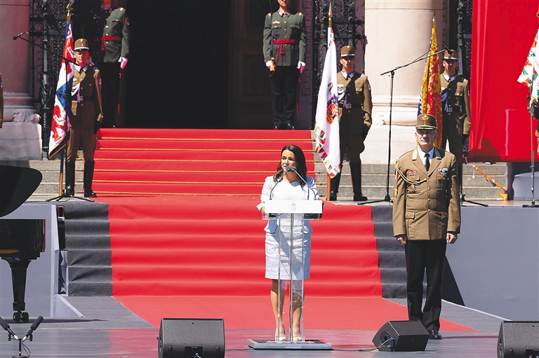 5月14日,匈牙利总统诺瓦克·卡塔琳在布达佩斯国会大厦前出席就职典礼时发表讲话。