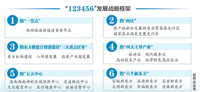 发展蓝图已绘就,扬帆奋进正当时。东方确定的“123456”发展战略框架:“1”是指“一节点”,即西部陆海新通道重要节点;“2”是指“两区”,即港产城融合发展的自由贸易港先行区、国家农业绿色发展先行区;“3”是指东方推进自贸港建设“三大重点任务”,即东方机场建设、八所港发展、临港产业园发展;“4”是指“四大主导产业”,即旅游业、现代服务业、高新技术产业、热带特色高效农业;“5”是指“五大中心”,即海南西南部的区域经济中心、交通物流中心、文化教育中心、医疗健康中心、旅游消费中心;“6”是指“六个新东方”,即富裕新东方、品质新东方、美丽新东方、文明新东方、幸福新东方、清廉新东方。