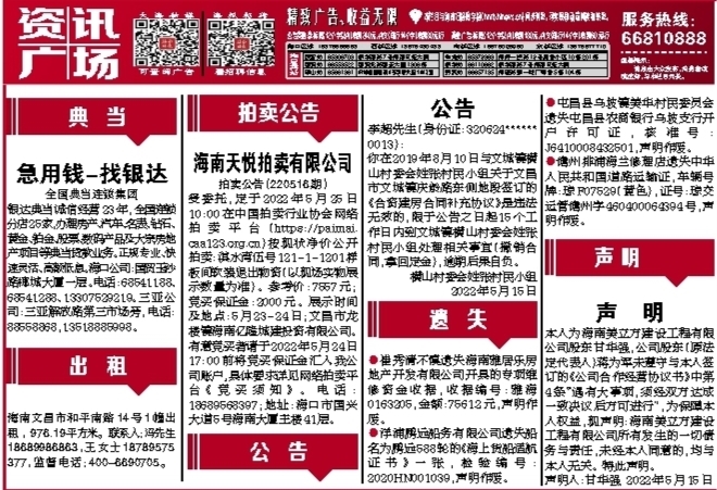 银达典当诚信经营23年,全国连锁分店25家,办理房产、汽车、名表、钻石、黄金、铂金、股票、数码产品及大宗房地产项目等典当贷款业务。正规专业、快速灵活、高额低息。海口公司:国贸玉沙路椰城大厦一层。电话:68541188、68541288、13307529219。三亚公司:三亚解放路第三市场旁,电话:88558868,13518885998。