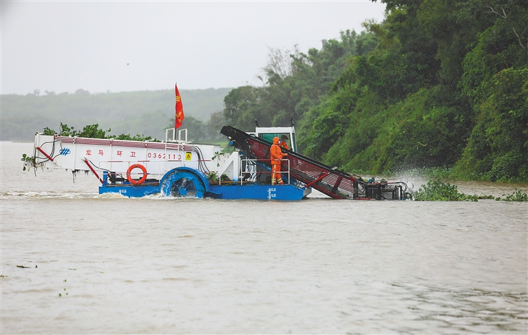 “我们公司负责南渡江流域从新坡镇泵站到龙泉镇,全长约20公里的水域保洁工作,工作量非常大。每次强降雨天气后,都会有水浮莲从南渡江上游冲下来,不及时清理的话会迅速繁殖,并造成河道阻塞,降低水体生物多样性等负面影响。”该公司副总经理廖万凯介绍,为提升水浮莲清理效率,该公司在2021年采购了两艘“割捞一体船”,实现了水浮莲的机械化打捞,提高了水域作业的质量。