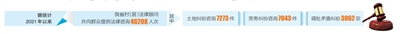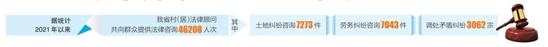 据统计,2021年以来,我省村(居)法律顾问共向群众提供法律咨询46208人次,其中土地纠纷咨询7273件、劳务纠纷咨询7043件,调处矛盾纠纷3062宗。