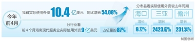 分行业看,前4个月海南现代服务业实际使用外资9亿美元,占总量的87%;分市县看,海口、三亚、儋州实际使用外资分别较去年同期增长9.22%、2423.67%、231.54%。