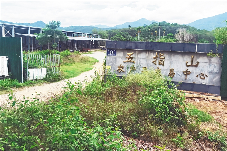 在番阳镇,记者发现一个名为“五指山农产品交易中心”的市场,但门口的“五指山农产品交易中心”10个大字已被野草遮挡,大门上爬满藤蔓。该交易中心闲置已久,大多区域野草丛生,铁棚下摆放的一些果蔬收购器械布满灰尘,部分建筑被用于经营钢筋加工等。