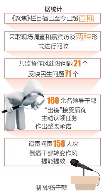 据统计,《聚焦》栏目播出至今已超百期,采取现场调查和嘉宾访谈两种形式进行问政,共监督作风建设问题21个,反映民生问题71个。其中生态环境类问题14个,重点项目类问题9个,精准扶贫类问题8个,饮水安全类问题7个,交通出行类问题7个,文化教育类问题9个,卫生健康类问题5个,营商环境类问题2个,其他问题10个。解决百姓“急难愁盼”问题16个。160余名领导干部“出镜”接受质询、主动认领任务、作出整改承诺,先后曝光问题142个,追责问责158人次,倒逼干部转变作风、提能提效。