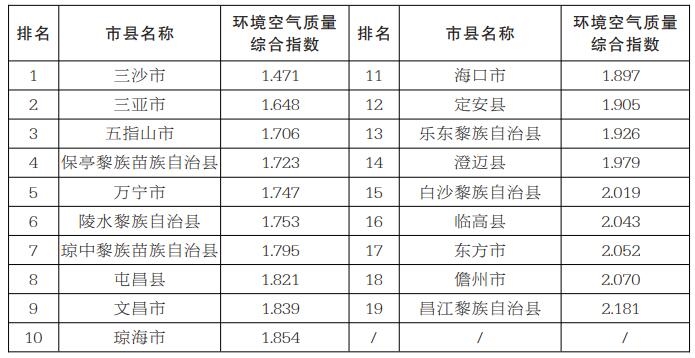 环境空气质量排名靠前的市县分别是三沙市、三亚市和五指山市,排名靠后的市县分别是昌江黎族自治县、儋州市和东方市。2022年4月全省19个市县环境空气质量排名如右: