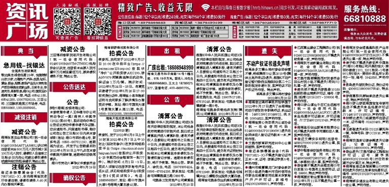 受委托,我司定于2022年5月27日上午10点在中拍平台(https://paimai.caa123.org.cn)按现状“净价”公开拍卖琼AKC100、琼AHV979两辆旧机动车,保证金1万元/辆。展示时间:2022年5月24~25日。有意竞买者请于2022年5月26日17:00前凭身份证件、海南省小客车指标证明与我司联系了解详情及办理竞买手续。地址:海口市国贸大道1号景瑞大厦A座21层,电话:0898-31302088、15008983855。