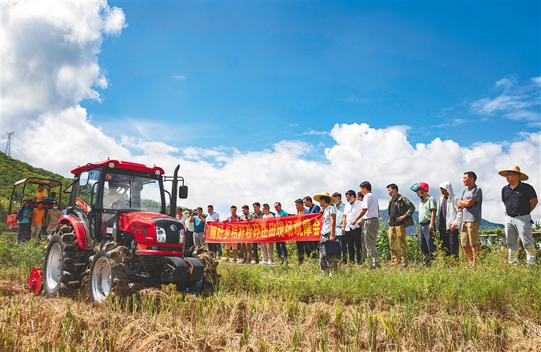 5月19日,五指山市畅好乡举办秸秆粉碎还田现场观摩会,推广使用农用机械,高效助力秸秆还田。据了解,畅好乡采购粉碎机、旋耕机并培训村民操作使用,旨在提高秸秆利用率,减少因秸秆燃烧造成的大气污染,同时美化、净化村居环境。本报记者 李天平 摄