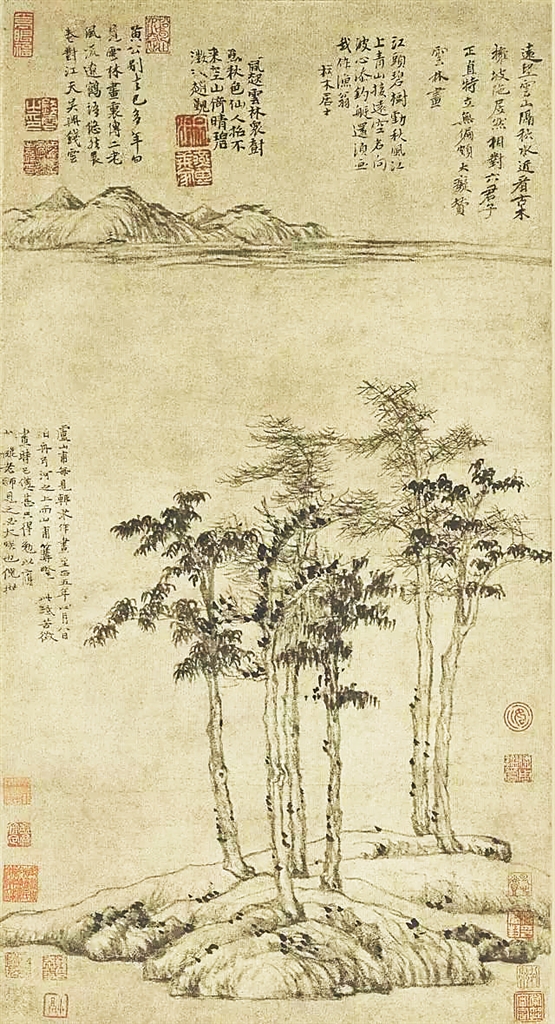 黄公望题跋:“远望云山隔秋水,近看古木拥陂陁。居然相对六君子,正值特立无偏颇。”正是起名由来。