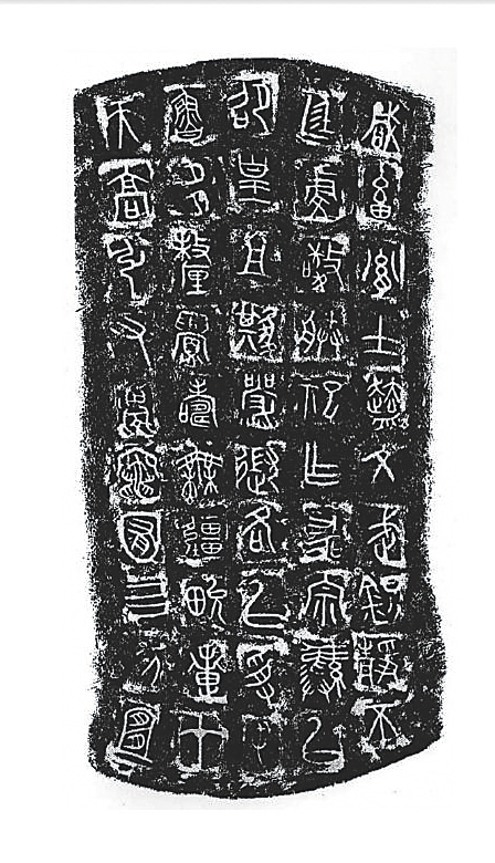 从故宫博物院收藏的十件先秦石鼓(又称“ 陈仓石鼓”)上,可以看见中国最早的石刻文字,被称为“篆书之祖”,一字抵万金,被康有为誉为“中华第一文物”。这十只先秦石鼓,每件高二尺,直径一尺多,每个重约一吨,每个石鼓上镌刻的“石鼓文”,都是秦始皇统一中国之前秦国使用的大篆,从书法史的角度看,它上承秦公簋(原藏北京故宫博物院,现藏中国国家博物馆)铭文,下接小篆,是中国文字由大篆向小篆衍变,在尚未定型时期的过渡性字体,结体促长伸短,字形方正丰厚,笔触又圆融浑劲,风骨嶙峋又楚楚风致,透露出秦国上升时期强悍雄浑的力量感。大篆的写法,各国不同,笔画烦琐华丽,巧饰斑斓。