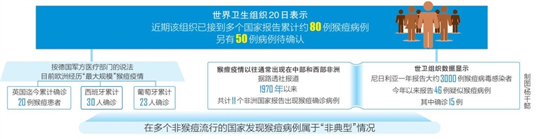 连日来,非洲以外报告猴痘病例的国家和感染病例数不断增多,许多感染者没有猴痘流行地区旅行史。世卫组织表示,在多个“非流行国家”出现与疾病流行地区没有直接旅行联系的猴痘病例,这是“非典型”状况,目前仍在调查感染源。
