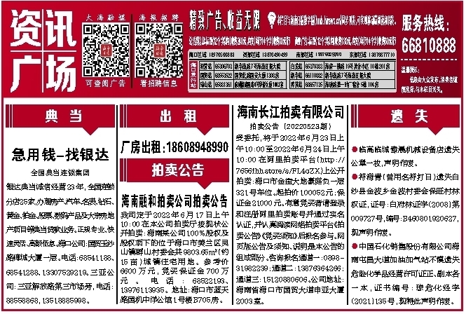 受委托,将于2022年6月23日上午10:00至2022年6月24日上午10:00在阿里拍卖平台(http://7656fhh.store/s/FL4oZX)上公开拍卖:海口市金盘大地豪庭负一层321号车位。起拍价100052元;保证金21000元。有意竞买者请登录和注册阿里拍卖账号并通过实名认证,并认真阅读网络拍卖平台《拍卖公告》《竞买须知》后报名参与。网页版公告及须知、说明是本公告的组成部分。咨询报名通道一:0898-31982239;通道二:13876364266;通道三:15120880606。公司地址:海南省海口市国贸大道申亚大厦2003室。